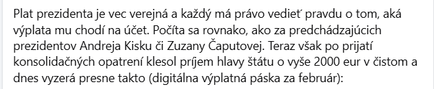 Príspevok s výplatnou páskou vysvetľuje výšku prezidentovho platu po znížení vrátane detailov o príjme.