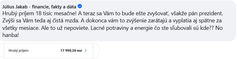 Július Jakab upozorňuje na vysoký hrubý príjem prezidenta a spochybňuje vládne sľuby.