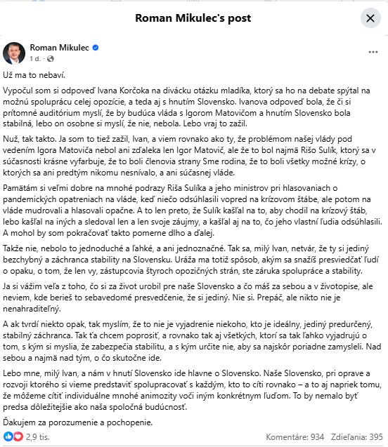 Mikulec zároveň pripomína, že politika nie je o osobných sympatiách, ale o ochote spolupracovať v prospech krajiny. Tvrdí, že nie je správne, aby hnutie Slovensko bolo vopred vyradené zo spolupráce len kvôli predsudkom voči Igorovi Matovičovi.