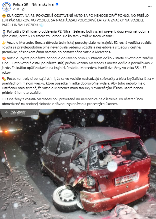 Pri príchode polície sa situácia ešte viac zamotala. Hliadka z Diaľničného oddelenia Policajného zboru Nitra – Selenec si všimla podozrivý obsah vo vnútri Mercedesu. Posádka auta dobrovoľne vydala striekačky a malé vrecko s bielou kryštalickou látkou, ktorá sa momentálne analyzuje.