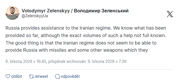 Podľa Zelenského zároveň existujú náznaky, že Rusko spolupracuje s iránskym režimom. Ukrajinský prezident však zároveň označil za pozitívnu správu fakt, že Moskva pravdepodobne nemá kapacity na dodanie niektorých zbraní, ktoré sama využíva vo vojne proti Ukrajine.