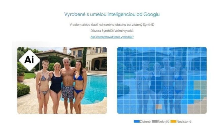 Technológia Google odhalila v obrázku prítomnosť digitálneho vodoznaku SynthID, ktorý sa používa pri výstupoch umelej inteligencie. Nástroj zároveň určil, že pravdepodobnosť AI pôvodu je „veľmi vysoká“.